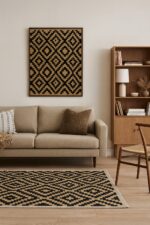 This handcrafted jute carpet features a bold geometric pattern in natural jute tones and deep black, creating a striking visual contrast. Woven with precision, the design showcases repeating diamond and step motifs that give the rug a modern tribal appeal. The natural jute fiber adds durability, eco-friendliness, and a warm earthy texture, making it perfect for living rooms, bedrooms, hallways, or office spaces. Its strong weave ensures long-lasting performance while maintaining a stylish, contemporary look